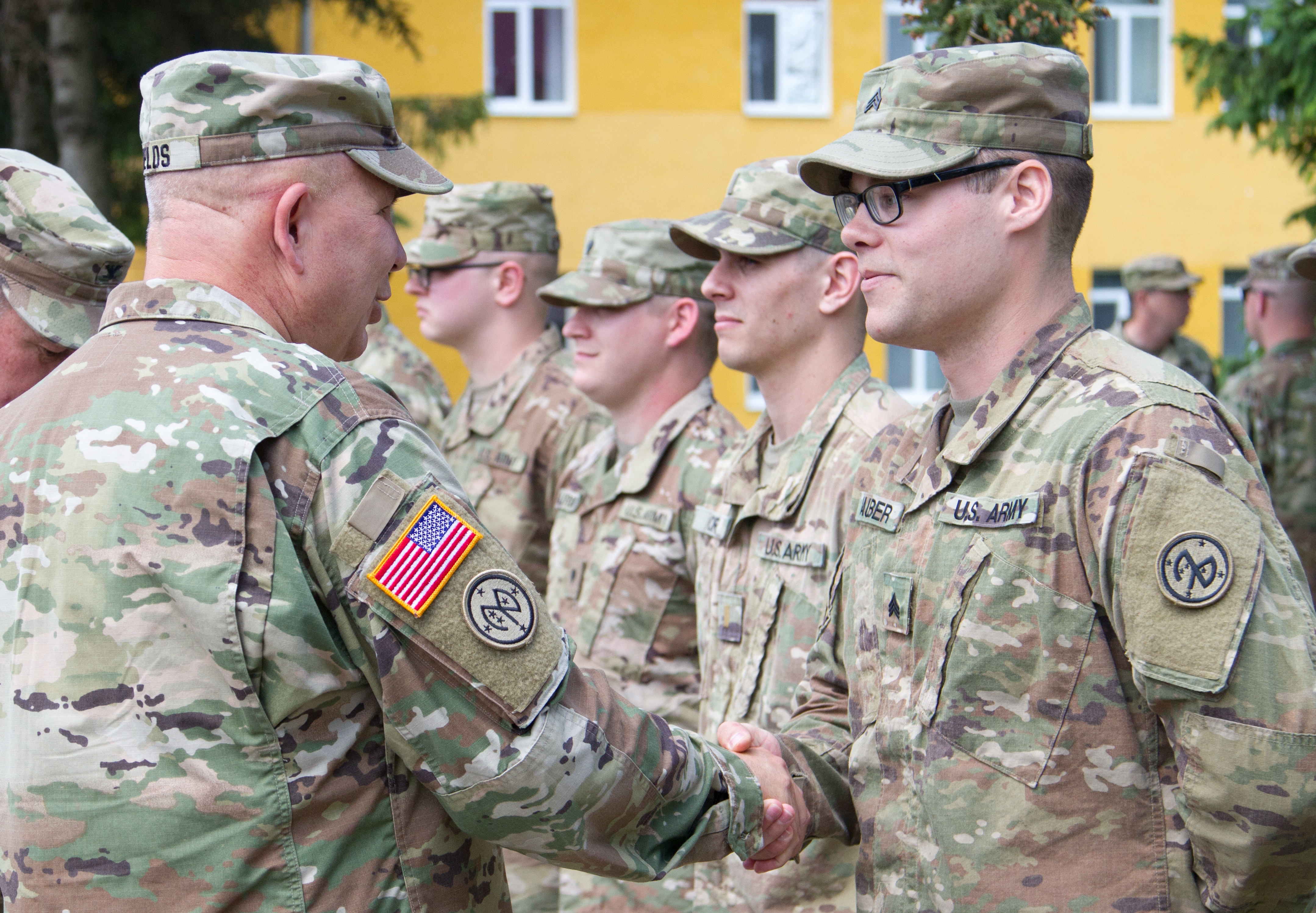 NY Army National Guard Commander Major Gen. Ray Shield's recognizes Soldier during May 25 visit to Ukranian training base