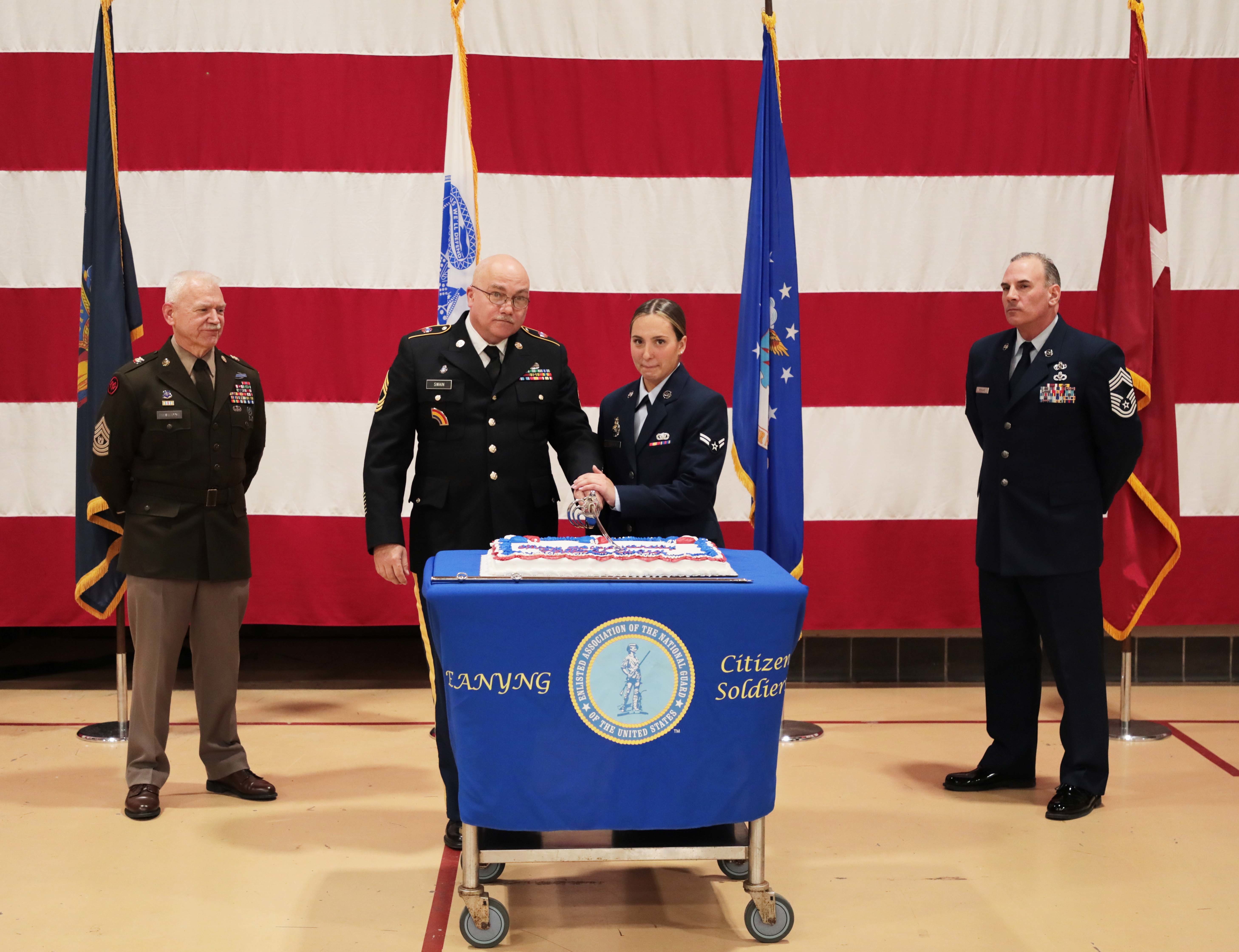 Swain, age 60, was the oldest Guardsman present. The other cake cutter was 18-year-old Airman 1st Class Emma Davignon, from Cobbleskill, who is assigned to the New York Air National Guard's 109th Airlift Wing.