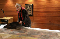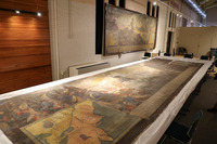 The painting, "Benedict Arnold triumphant at Saratoga", was unrolled in the museum's meeting room so that John Lippert, a partner in the firm of Foreground Conservation & Decorative Arts, a Livingston company that specializes in restoring artwork, could examine it.